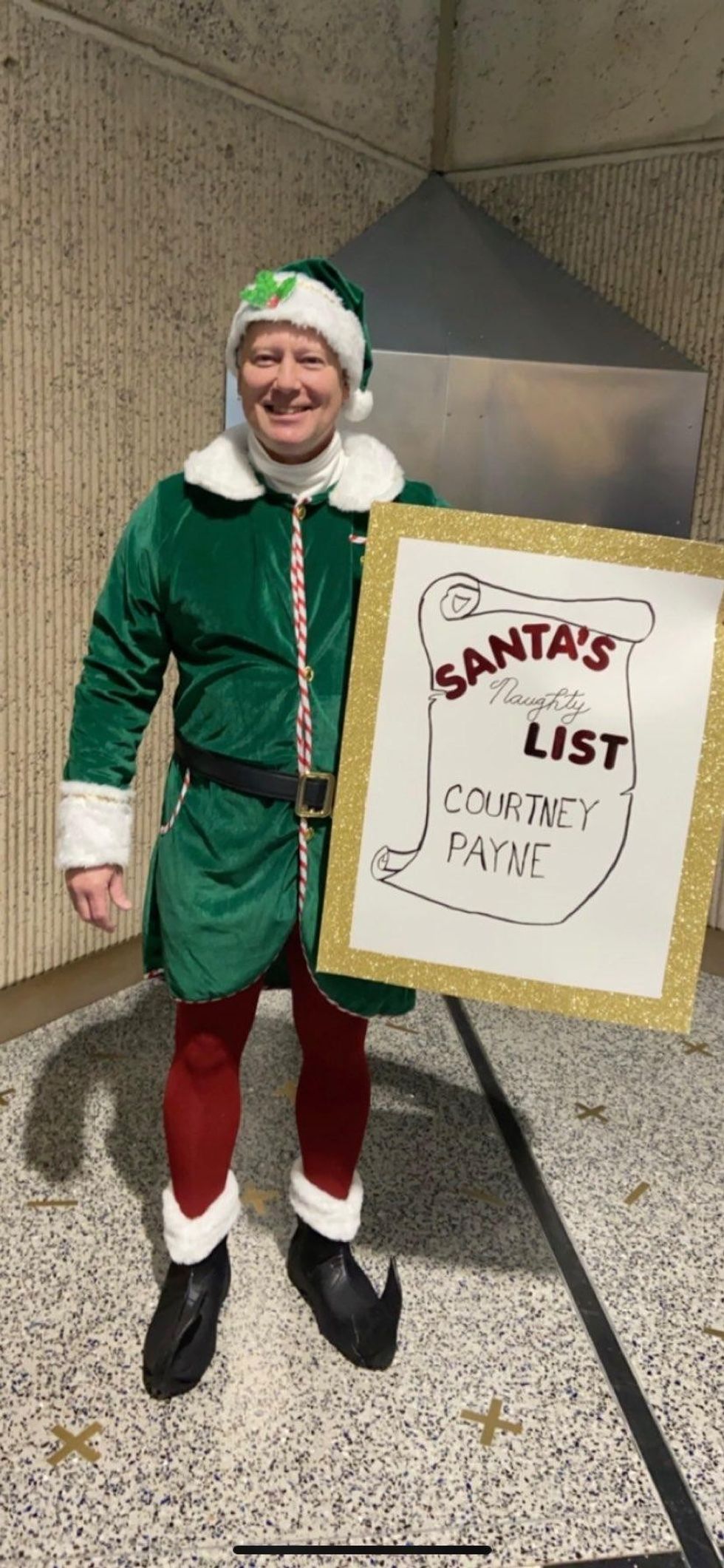 So random. So funny. But perhaps the kicker is what happened this year. Not to be outdone by his previous efforts, Doug showed up to the airport to pick Courtney up in a full Christmas elf costume, with a sign that said, "Santa's Naughty List" and then had Courtney's name.