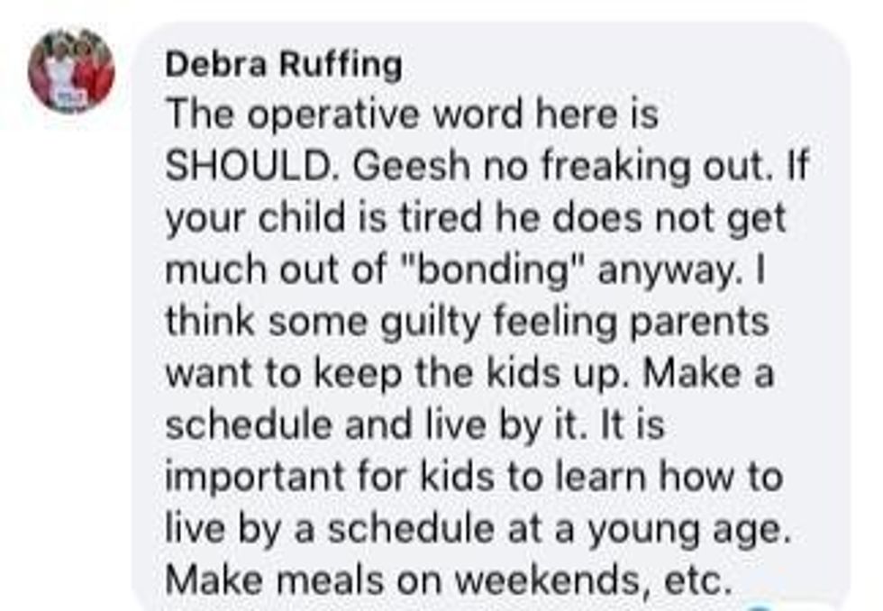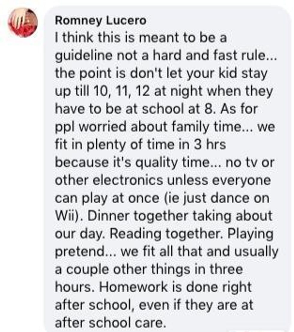If you're 12 years old and get up at six every morning, 8:15 p.m. is your ideal bedtime. This seems unrealistic for a lot of folks, and people were not afraid to say so in the comments."In a perfect world, yes," one person wrote. "But not every child is the same nor can a lot of parents follow this because of lifestyle. For example, I work 12-hour shifts. Going by this chart I would only see my children on weekends for the first six years of their lives. It's unrealistic in today's society for a lot of people."