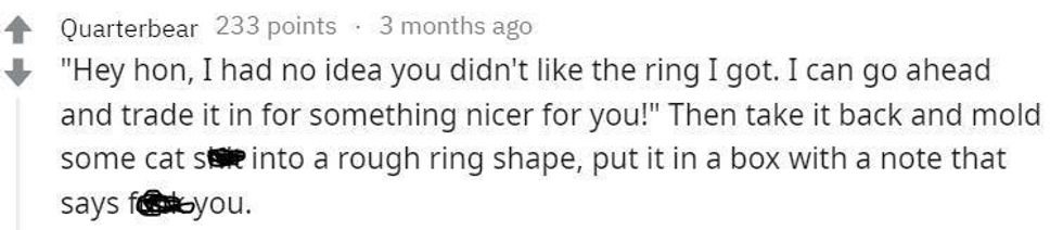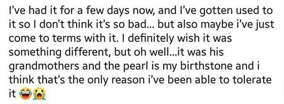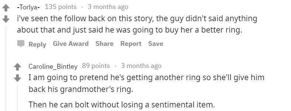 One might say it's pretty classless for her to turn to the internet to vent about her ring, but it's not like she could talk to anyone in her boyfriend's family or immediate circle about it. Word travels fast, and maybe the news spreading to her husband-to-be could really hurt his feelings, seeing as it belonged to his grandmother and probably means a great deal to him.On the other hand, her story now has gone viral, so if the dude browses Reddit or other media sites, there's a good chance he'll recognize the ring and his girlfriend's blurred-out face.