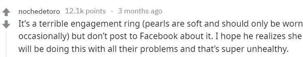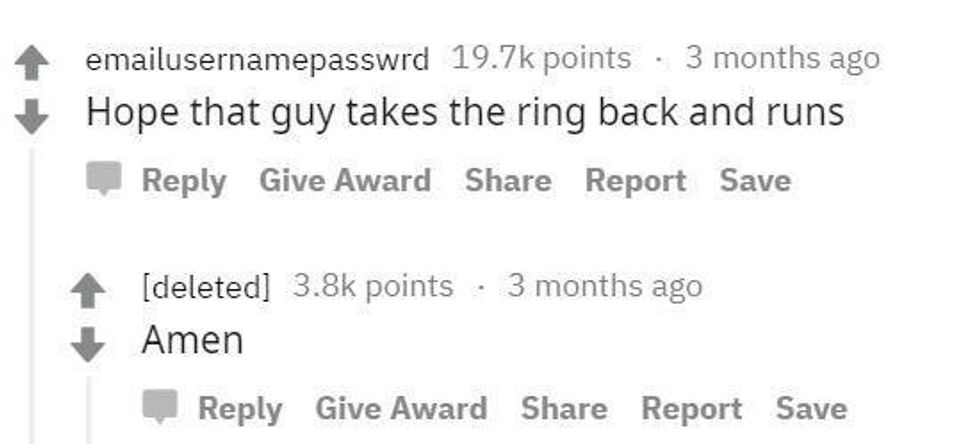 The responses to her post varied. A lot of people thought she was being conceited and didn't deserve someone willing to make themselves so vulnerable by giving her a ring with so much sentimental value.